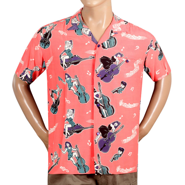 Double Bass Pinups printed shirt from Star of Hollywood collection. This blue shirt features a variety of pinup girls posing with and playing double bass along with musical notes printed...