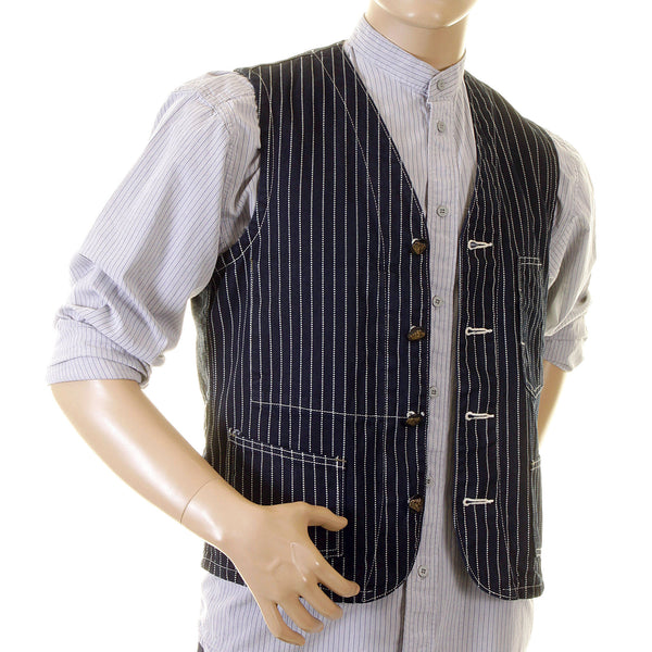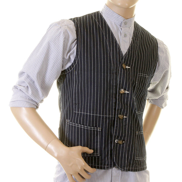 Sugarcane striped work vest for men. This vintage cut waistcoat is equipped with painted vintage finish donut metal buttons in black. This work wear vest is styled with two slit...